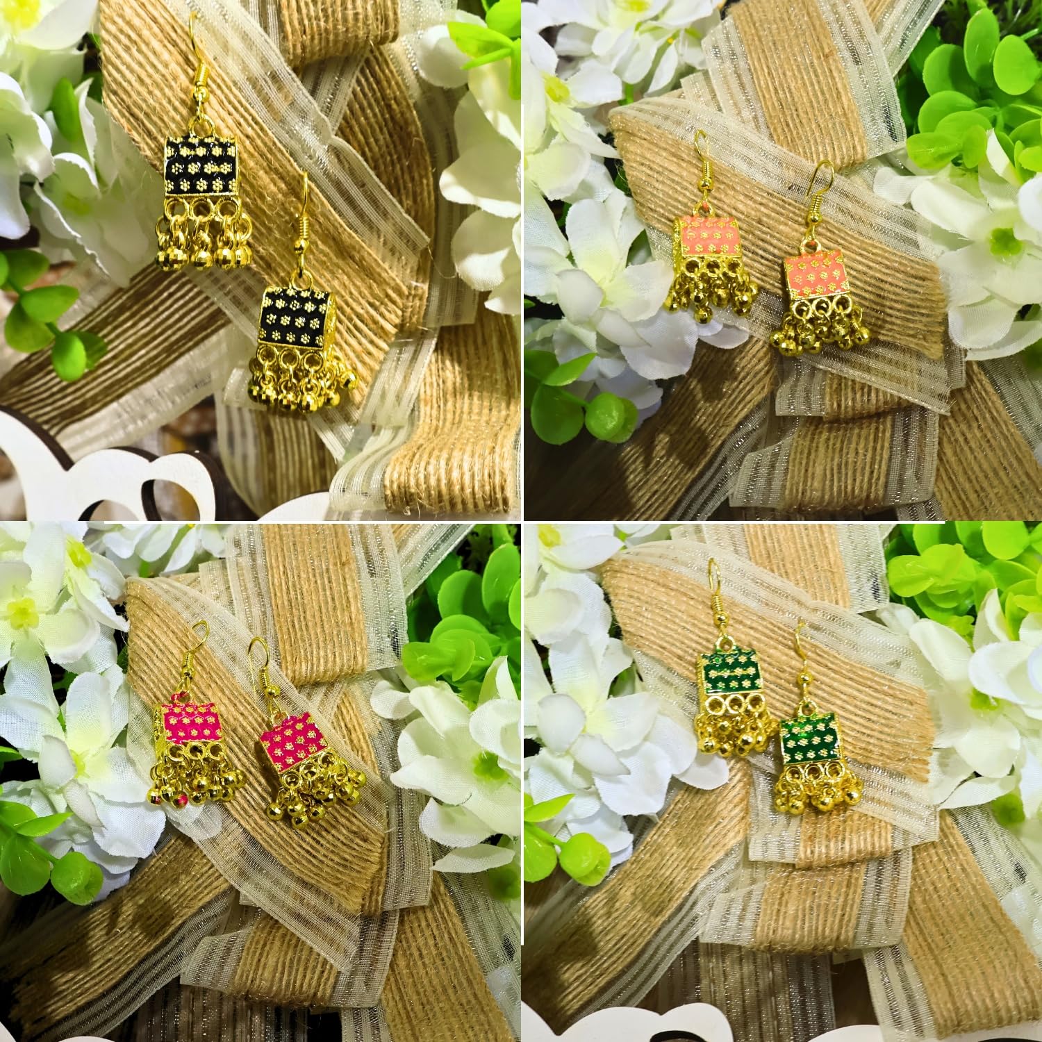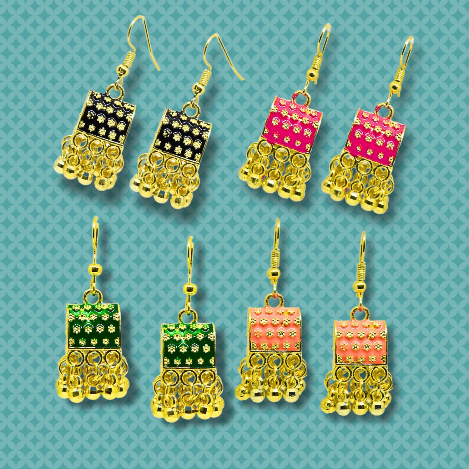 - Hook Earrings for Women, Easy-to-wear small jhumkas for women traditional and combo set of 4 colour, black-green-pink-orange, modern designs, great for everyday style.