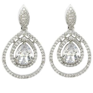 Zeneme Rhodium Plated Silver Toned American Diamond Crystal Lastest Fancy Dangle Dual Tear Drop Fancy Earring For Women & Gift For Girl (Opulent Shine White Earrings)